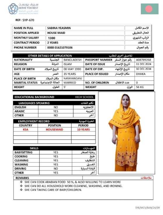Name - English SABINA YEASMIN