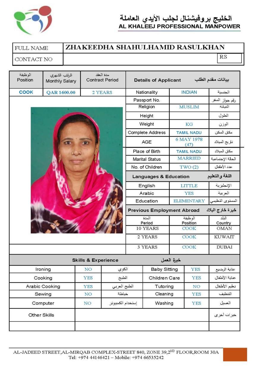 Name - English ZHAKEEDHA SHAHULHAMID RASULKHAN