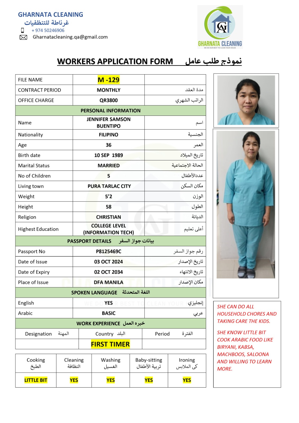 SHE CAN DO ALL HOUSEHOLD CHORES AND TAKING CARE OF THE KIDS . SHE KNOWS HOW TO COOK ARABIC FOODS LIKE BRIYANI KABSA MAZBOOSH SALOONA AND WILLING TO LEARN MORE
