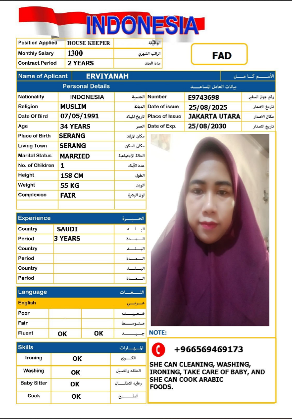 SHE KNOWS CLEANING ,WASHING ,IRONING BABYSITTING SHE CAN COOK ARABIC FOOD