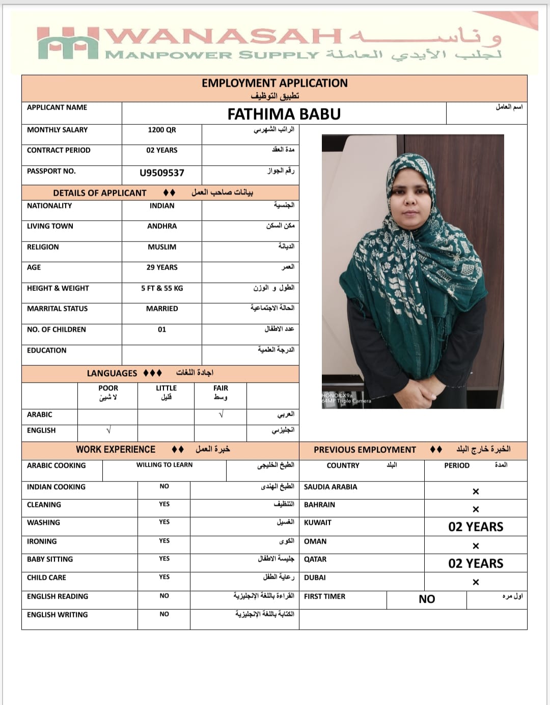 Name - English FATHIMA BABU / AVAILABLE IN DOHA