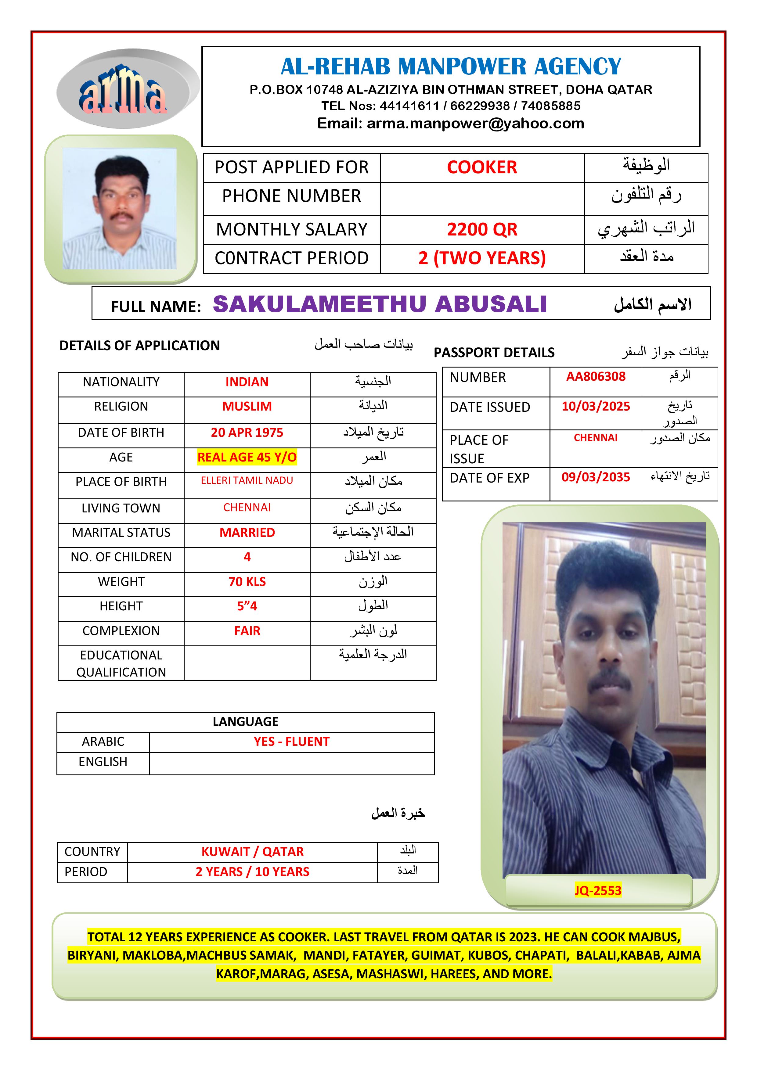 HE WORK IN KUWAIT 2 YEARS AND QATAR 10 YEARS. HE FINISHED QATAR LAST 2023.