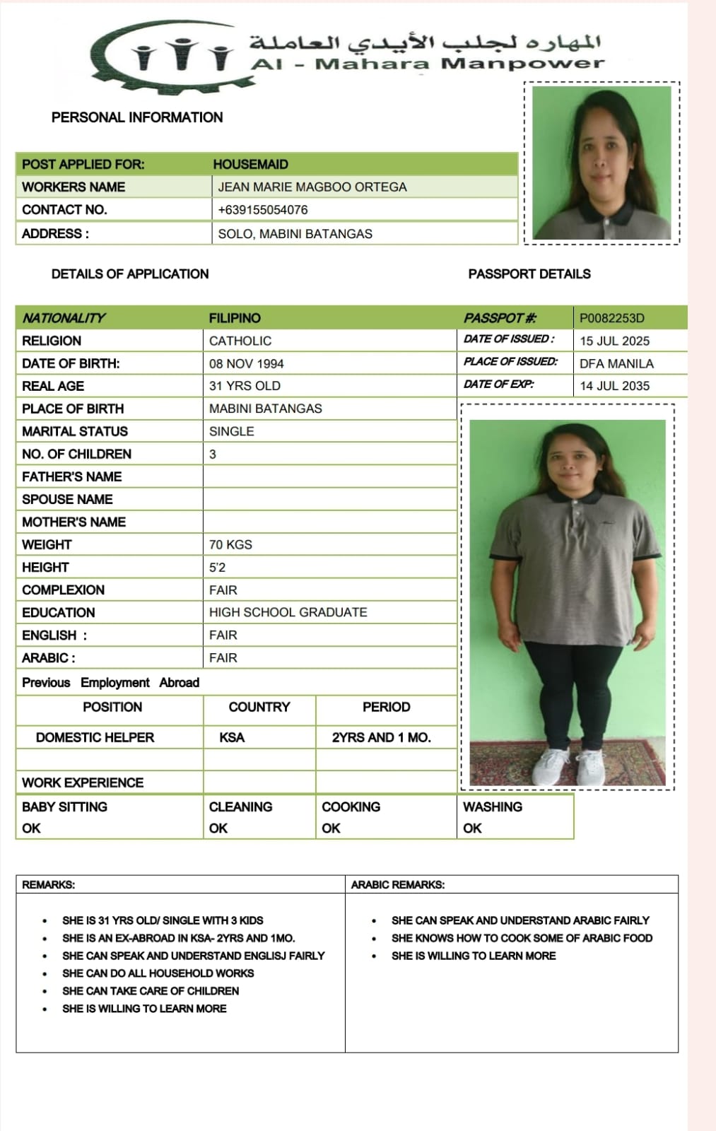 | SHE IS 31 YRS OLD/ SINGLE WITH 3 KIDS SHE IS A HIGH SCHOOL GRADUATE SHE CAN SPEAK AND UNDERSTAND ENGLISH FAIRLY SHE CAN DO ALL HOUSEHOLD WORKS SHE CAN TAKE CARE OF CHILDREN SHE IS WILLING TO LEARN MORE | |