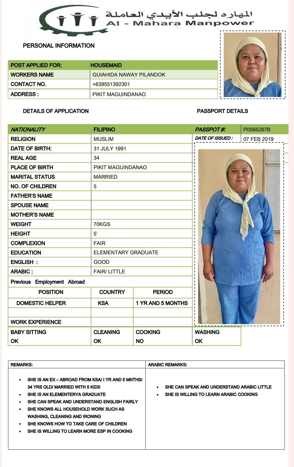 | SHE IS 34 YRS OLD/MARRIED WITH 5 KIDS SHE IS AN ELEMENTARY GRADUATE SHE CAN SPEAK AND UNDERSTAND ENGLISH GOOD SHE CAN DO ALL HOUSEHOLD WORKS SHE CAN TAKE CARE OF CHILDREN SHE IS WILLING TO LEARN MORE | |