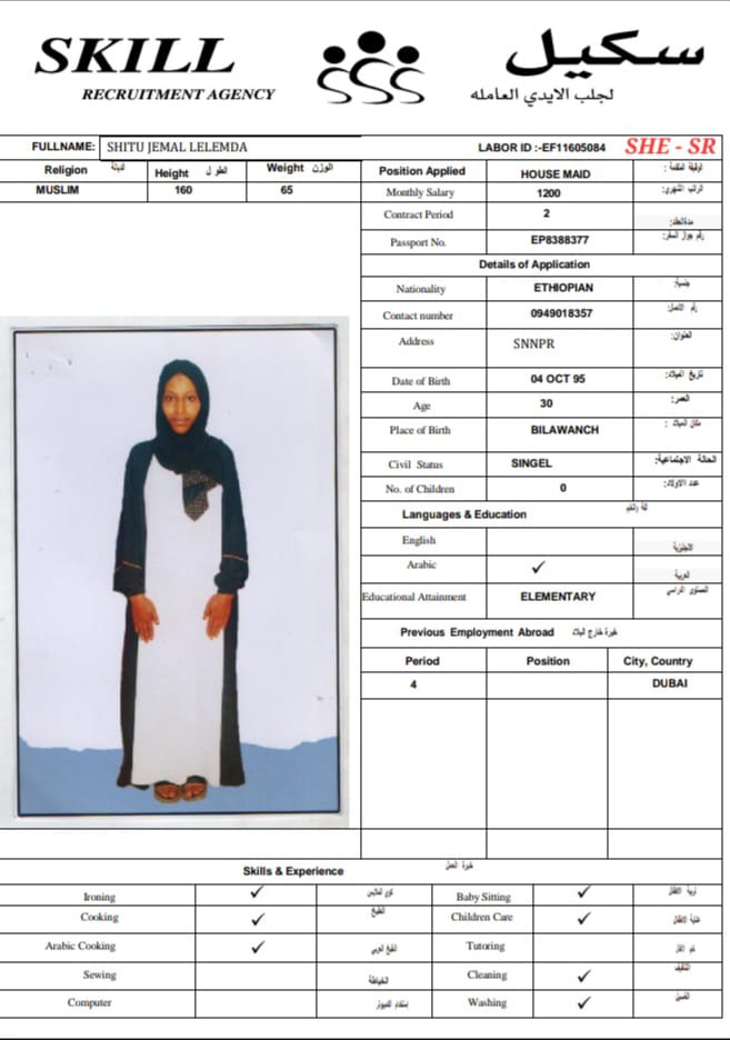 She has experience and finishes her contract in Dubai as a housemaid she knows house chores, and she is willing to learn on cooking Arabic food