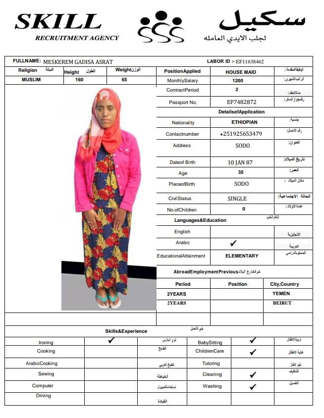 She has experience in Gulf as a housemaid she can clean ironing washing the clothes take care of kids and elderly she can learned on cooking Arabic food