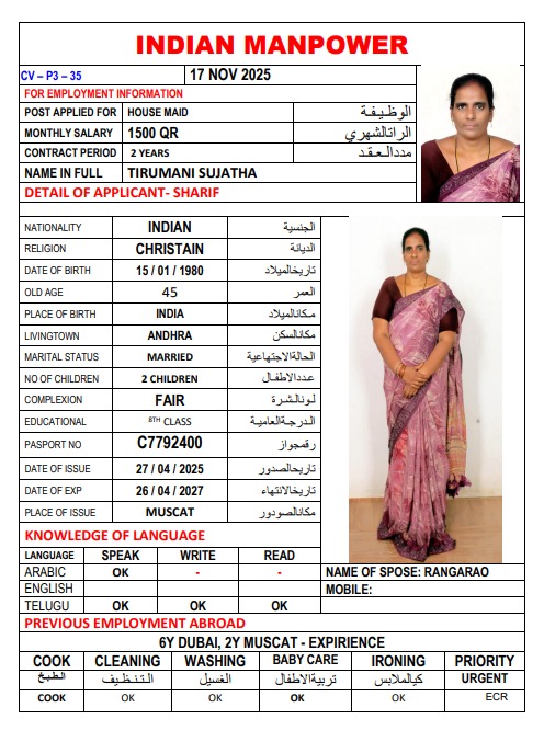 | SHE CAN DO ALL HOUSEHOLD WORK SUCH AS CLEANING, WASHING IRONONG AND COOK AS WELL | |