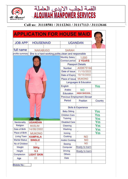 Welcome Are you looking for a driver, nurse, house manager, cleaner, nanny, secretary, professional workers for companies, security and guard personnel, foreman .... etc. Have you spent a long time looking for a maid? Have you made a great effort to find the right person? But to no avail ... Don't worry, we have the perfect solution to your problem Services…
