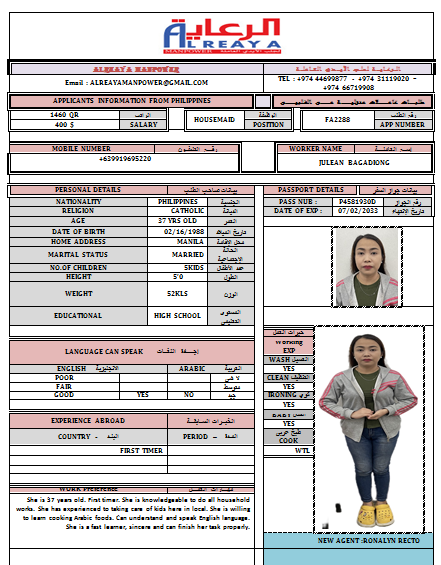 | She is 37 years old. First timer. She is knowledgeable to do all household works. She has experienced to taking care of kids here in local. She is willing to learn cooking Arabic foods. Can understand and speak English language. She is a fast learner, sincere and can finish her task properly. | |
