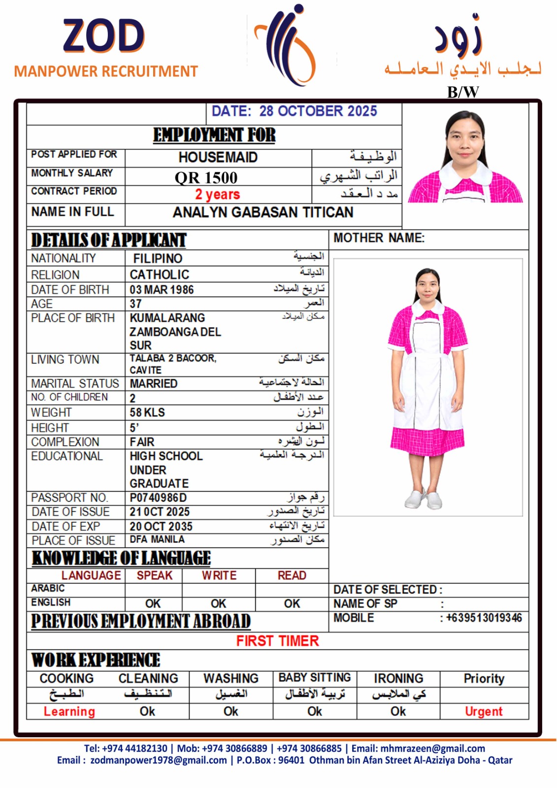 Name - English ANALYN GABASAN TITICAN