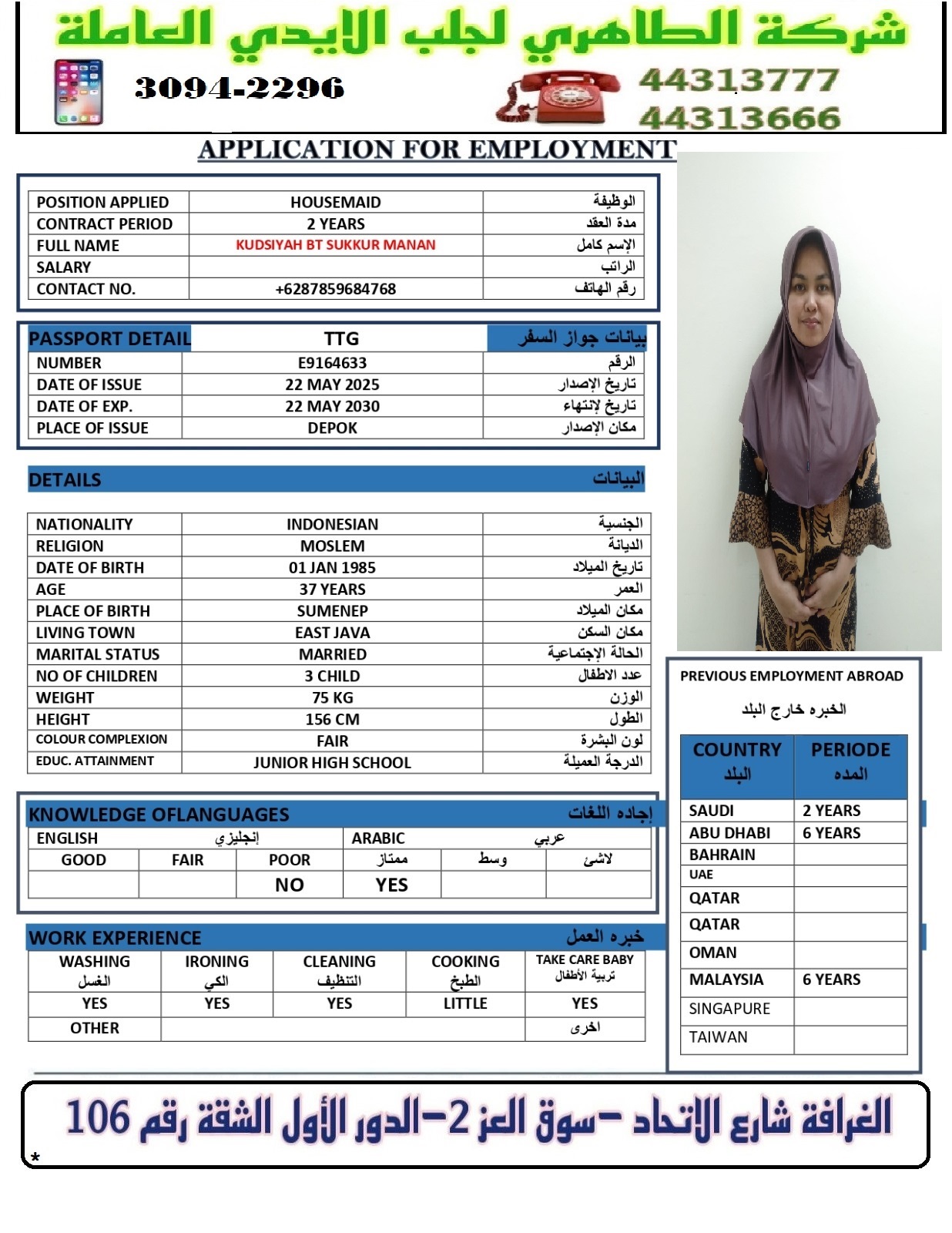 Welcome Are you looking for a driver, nurse, house manager, cleaner, nanny, secretary, professional workers for companies, security and guard personnel, foreman .... etc. Have you spent a long time looking for a maid? Have you made a great effort to find the right person? But to no avail ... Don't worry, we have the perfect solution to your problem Services…