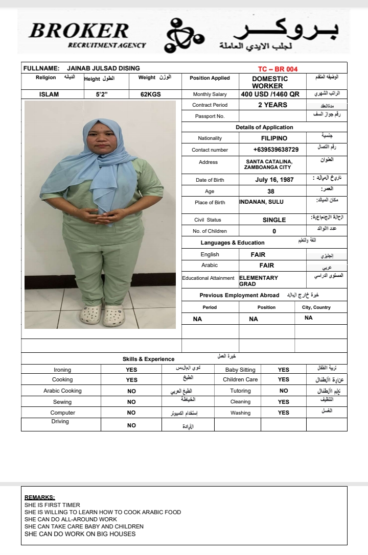 SHE IS A FIRST TIMER, SHE IS WILLING TO LWARN HOW TO COOK ARABIC FOOD, SHE CAN DO ALL-AROUND WORK, SHE CAN TAKE CARE OF A BABY, AND CHILDERN SHE CAN DO WORK ON VIG HOUSE.