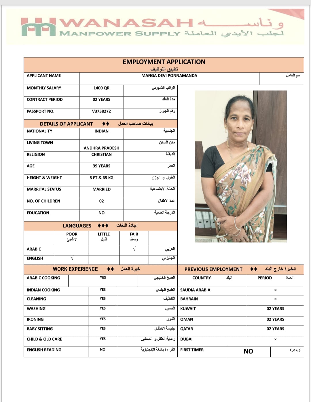 Name - English MANGA DEVI / COOK AVAILABLE IN DOHA