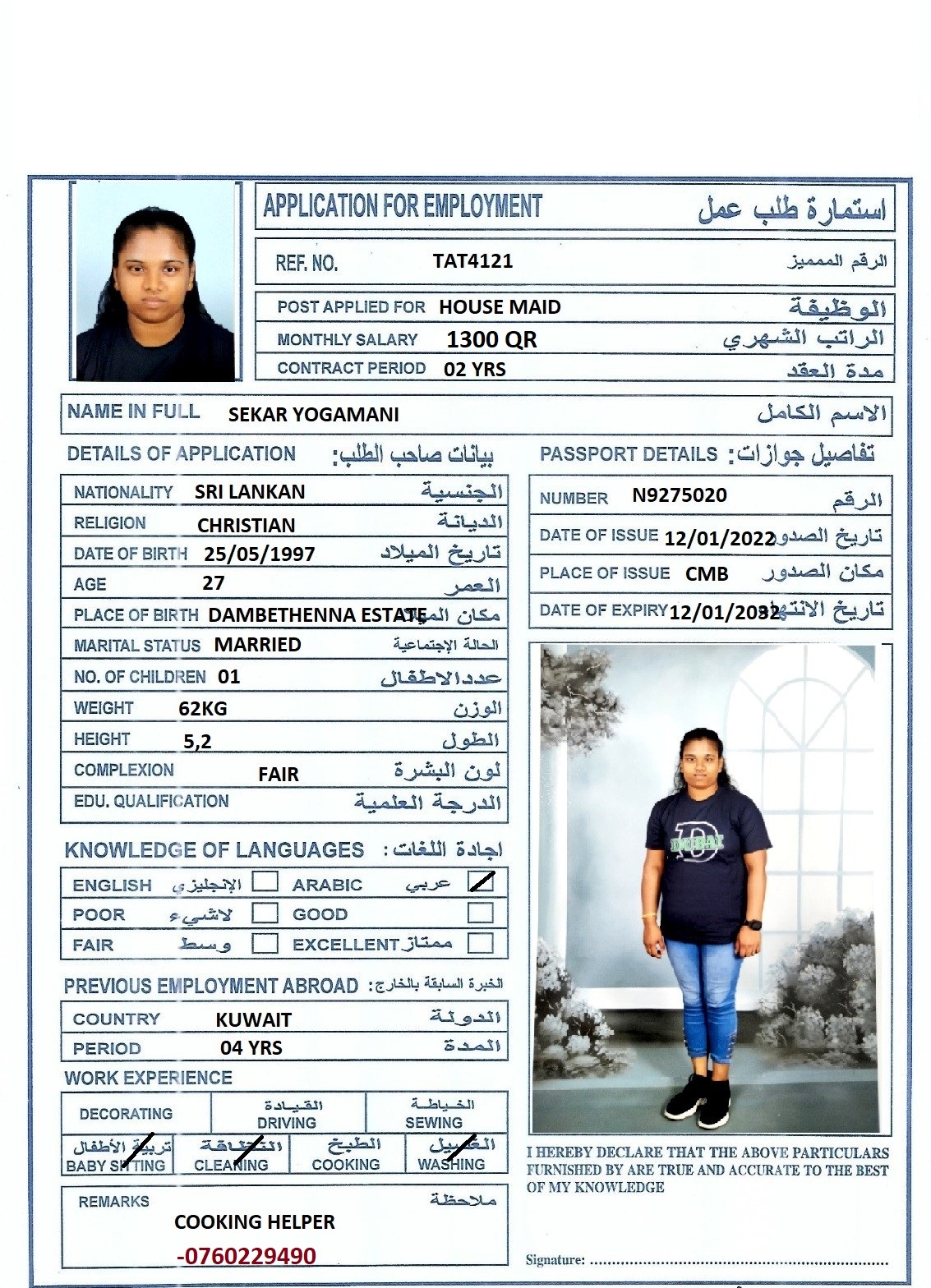 | > SHE IS FROM SRI LANKA , 27 YEARS OLD AND WORK BEFORE IN KUWAIT FOR 4 YEARS > SHE CAN CLEAN, IRON, WASHING CLOTHES AND ALL HOUSEHOLD CHORES > SHE CAN TAKE CARE A CHILDREN > SHE KNOW HOW TO COOK BASIC ARABIC FOOD | |