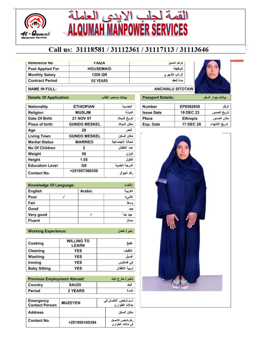Welcome Are you looking for a driver, nurse, house manager, cleaner, nanny, secretary, professional workers for companies, security and guard personnel, foreman .... etc. Have you spent a long time looking for a maid? Have you made a great effort to find the right person? But to no avail ... Don't worry, we have the perfect solution to your problem Services…