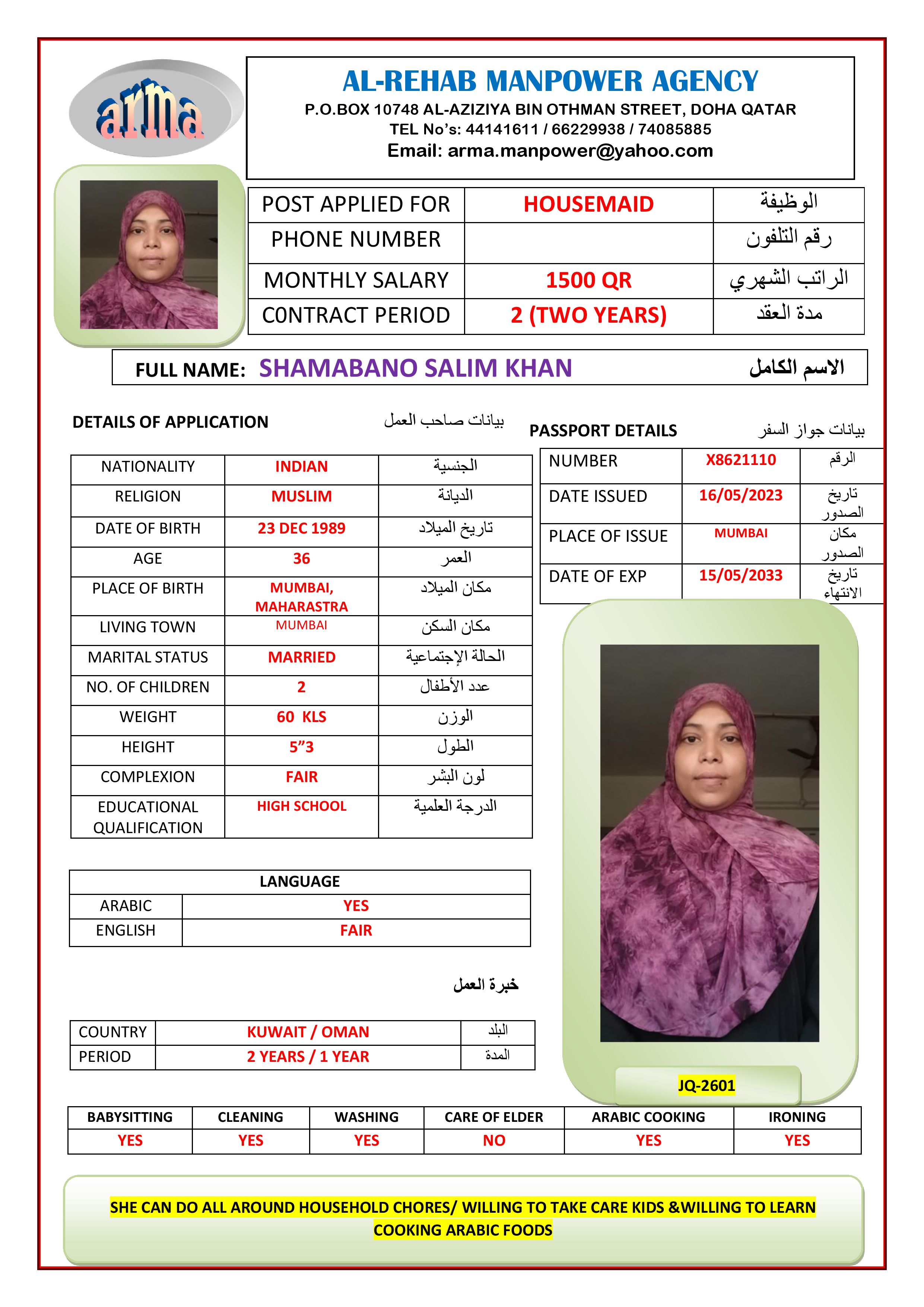 SHE CAN DO ALL HOUSEHOLD CHORES, WILLING TO TAKE CARE KIDS, SHE CAN COOK KUWAIT FOODS AND WILLING TO LEARN COOKING MORE ARABIC FOODS.