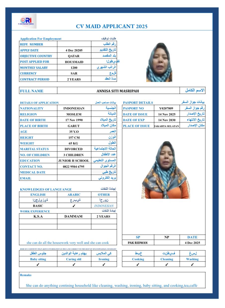| Name - English | ANNISA SITI MASRIPAH |