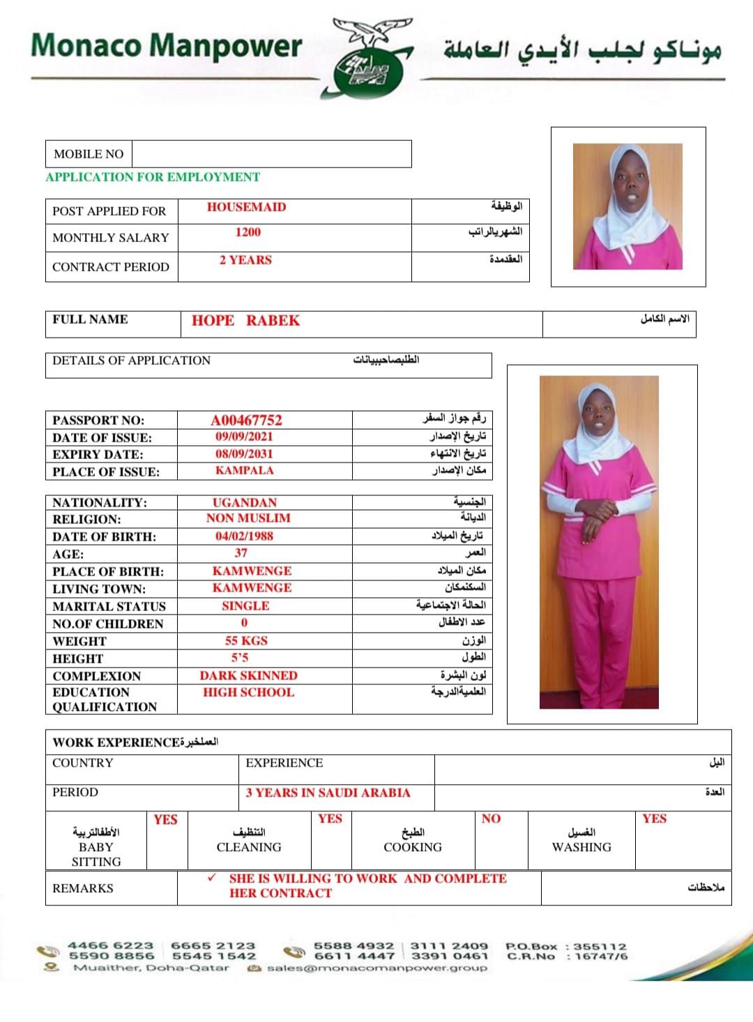 | SHE CAN DO THE HOUSEHOLD CHORES SHE CAN TAKE GOOD CARE OF CHILDREN WILLING TO EXCEED THE CONTRACT | |