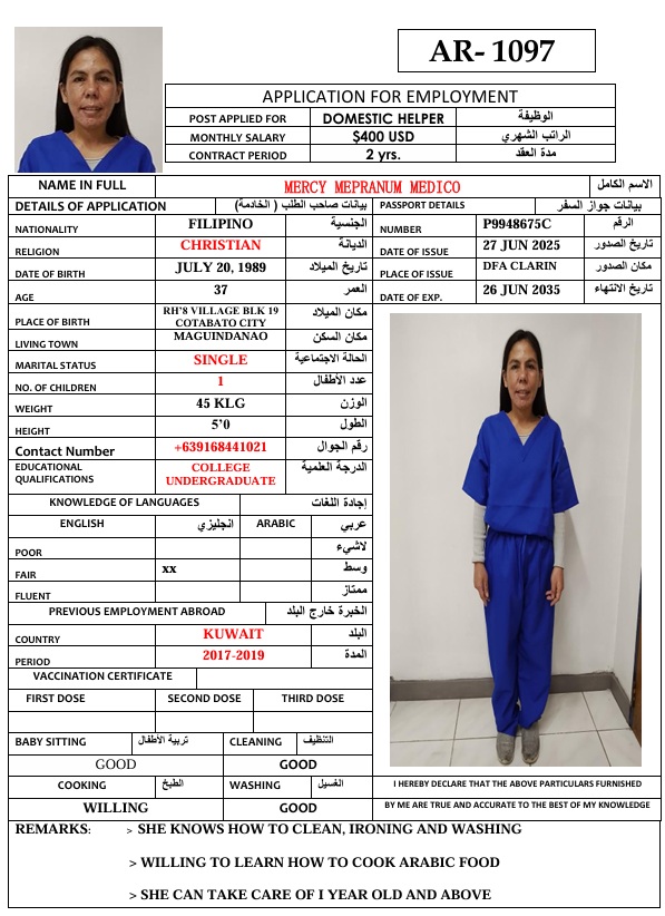 | > SHE IS FROM PHILIPPINES, 37 YRS OLD AND EX ABROAD FROM KUWAIT FOR 2 YEARS > SHE KNOW HOW TO CLEAN HOUSE, IRON CLOTHES, WASHING CLOTHES AND ALL HOUSEHOLD CHORES > SHE CAN TAKE A KID 1 YEAR OLD AND ABOVE < SHE IS WILLING TO LEARN HOW TO COOK ARABIC FOOD | |