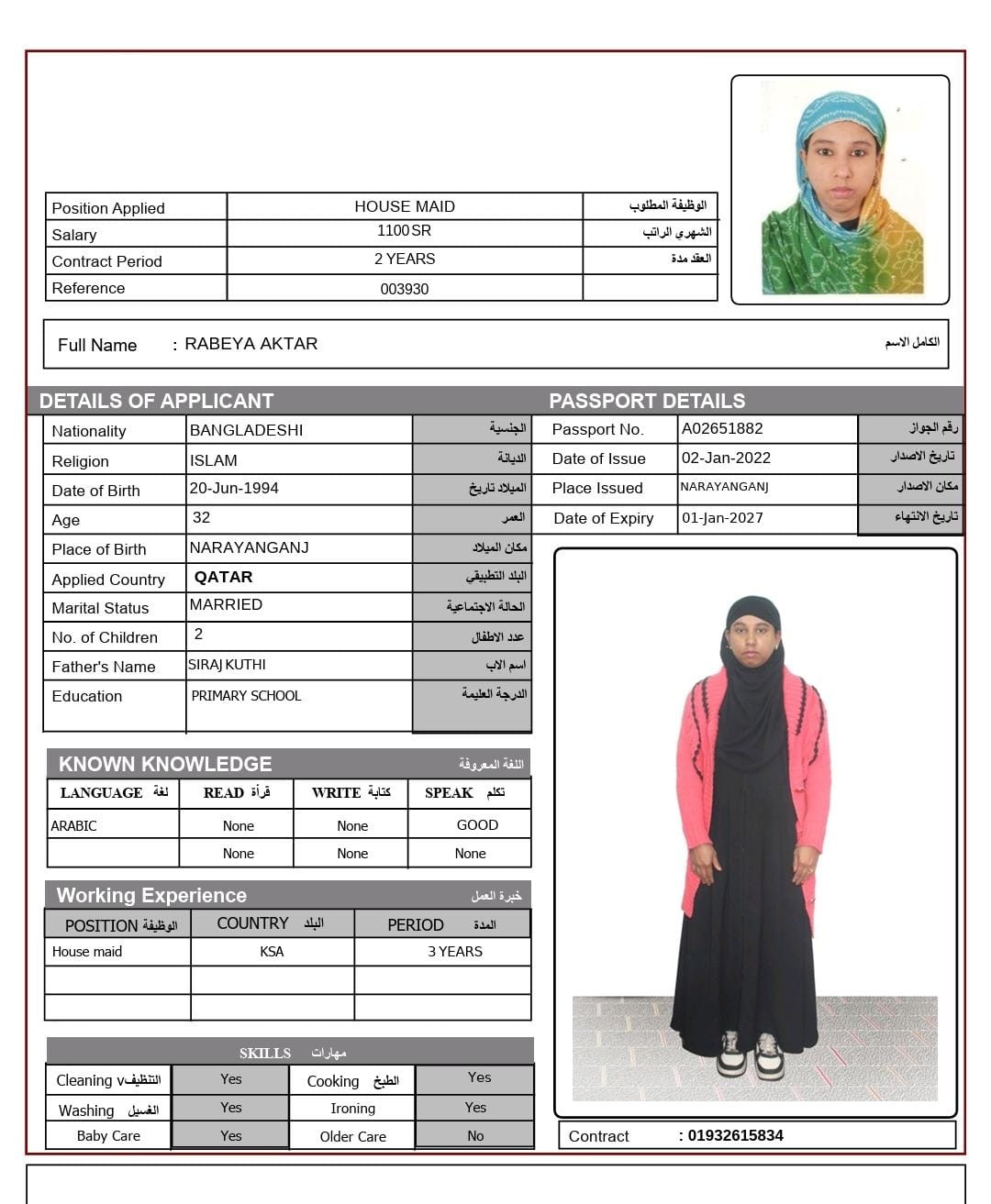 | > SHE FROM BANGLADESH, 32 YEARS OLD AND WORK BEFORE IN SAUD ARABIA FOR 3 YEARS > SHE CAN TAKE A CHILDREN >SHE CAN CLEAN HOUSE, IRON CLOTHES, WASHING CLOTHES AND ALL HOUSEHOLD CHORES > SHE KNOW HOW TO COOK BASIC ARABIC FOOD AND WILLING TO LEARN MORE | |
