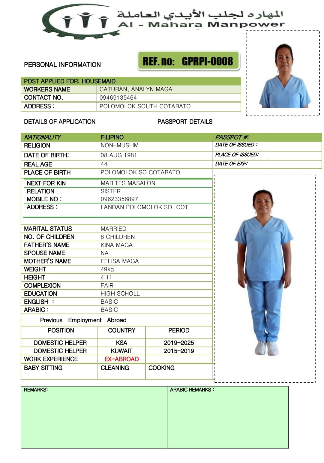 | SHE IS AN EX-ABROAD FROM KSA FOR 6 YRS AND KUWAIT FOR 4 YRS/44YRS OLD WITH 6 KIDS SHE IS A HIGH SCHOOL GRADUATE SHE CAN SPEAK AND UNDERSTAND ENGLISH FAIRLY SHE KNOWS ALL HOUSEHOLD WORKS SHE CAN TAKE CAREW OF CHILDREN AND ELDERLY SHE IS WILLING TO LEARN MORE | |