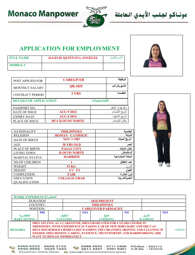 SHES APLYING AS A CAREGIVER, SHES GRADUATED FOR 4 YEARS COURSE IN MIDWIFERY, WITH EXPERIENCE IN TAKING CAR OF NEWBORN BABY AND SHE CAN HELP HOUSEHOLD CHORES LIKE WASHING THE CHLOTHES, IRONING AND CLEANING IF NEEDED. SHES HONEST, CARING, PATIENCE, TRUSTWORTHY AND HARDWORKING. SHE WANT TO DEPLOY IMMIDIATELY