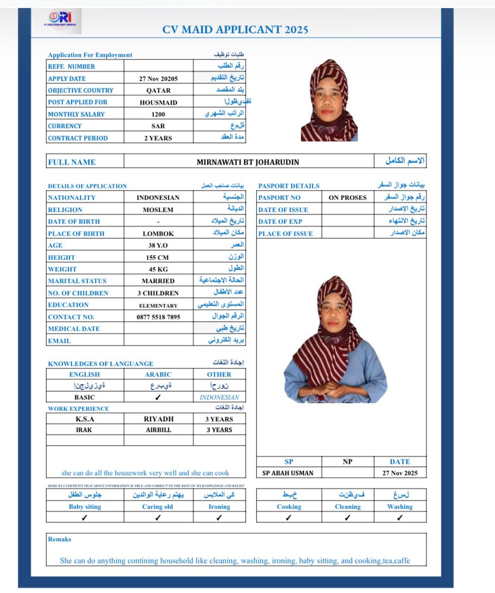 | SHE CAN COOK BASIC ARABIC FOOD SHE CAN TAKE CARE OF KIDS SHE CAN TAKE GOOD CARE OF CHILDREN WILLING TO LEARN HOW TO COOK ARABIC FOOD | |