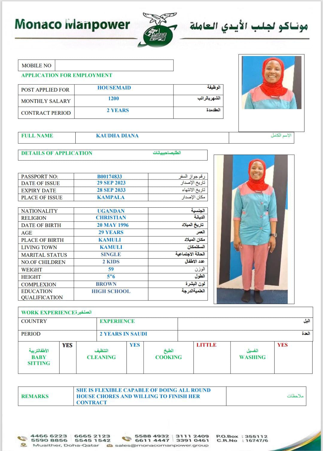| SHE CAN COOK BASIC ARABIC FOOD SHE CAN TAKE CARE OF KIDS SHE CAN TAKE GOOD CARE OF CHILDREN WILLING TO LEARN HOW TO COOK ARABIC FOOD | |