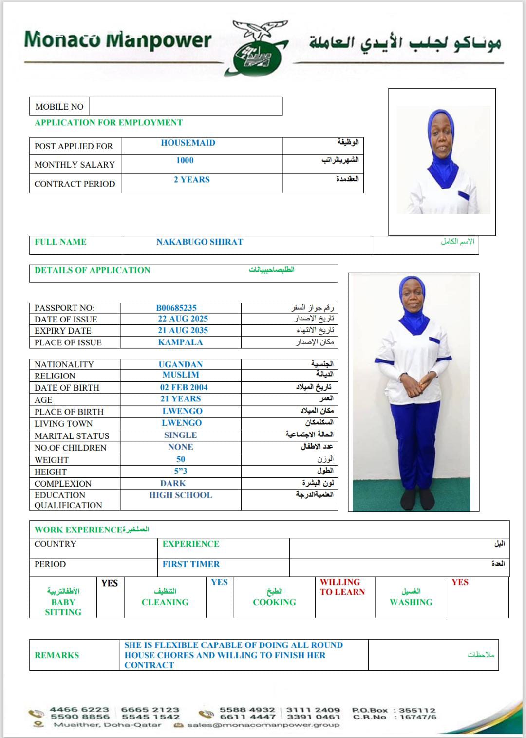 SHE CAN DO THE HOUSEHOLD CHORES SHE CAN TAKE GOOD CARE OF CHILDREN WILLING TO EXCEED THE CONTRACT | |