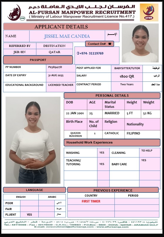 Name - English JISSEL MAE CANDIA