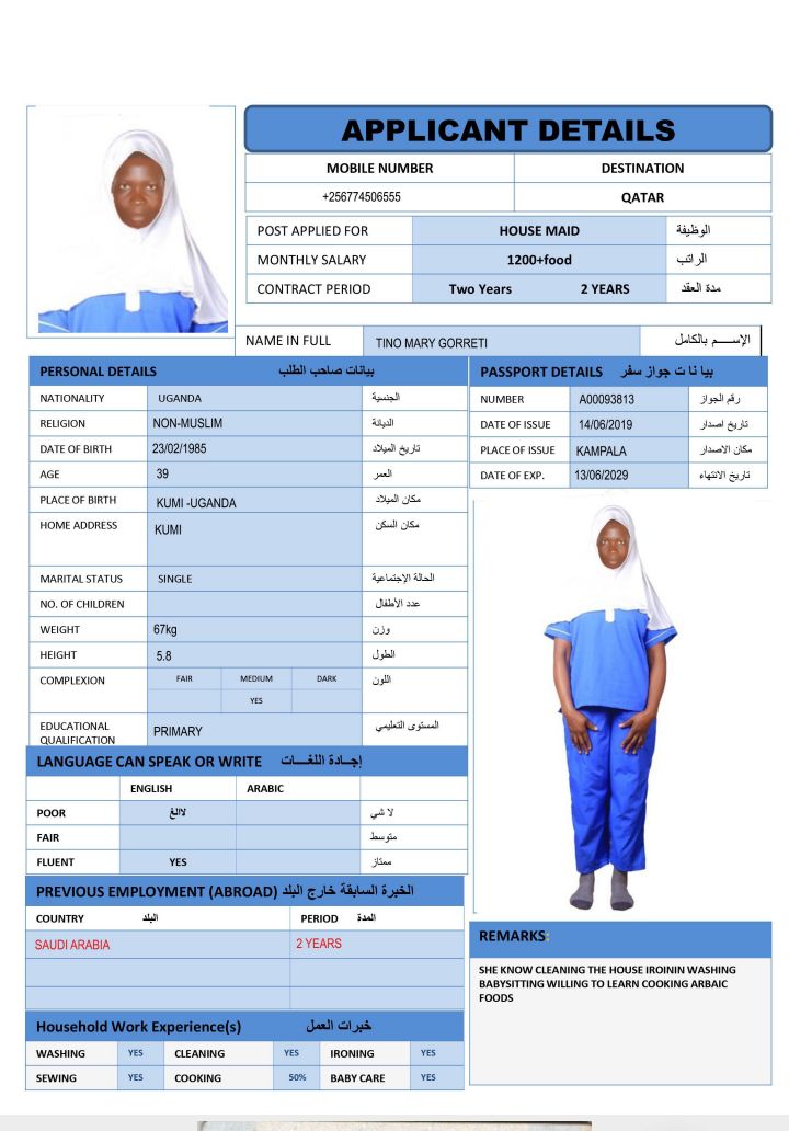 | Mary is in Uganda, willing to be recruited in Qatar,she has 2 years experience from Saudi Arabia, she can clean,wash,iron,take care of babies, help in the kitchen.salary is only 1200, office fees is 5000 riyals. Available on 2 years contract. Contact urban rock company on 71610363 for more details and inquiries. Thank you | |