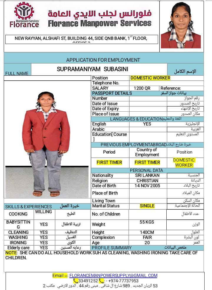 SHE CAN DO ALL HOUSEHOLD WORK SUCH AS CLEANING, WASHING IRONING AND TAKE CARE OF CHILDREN AS WELL