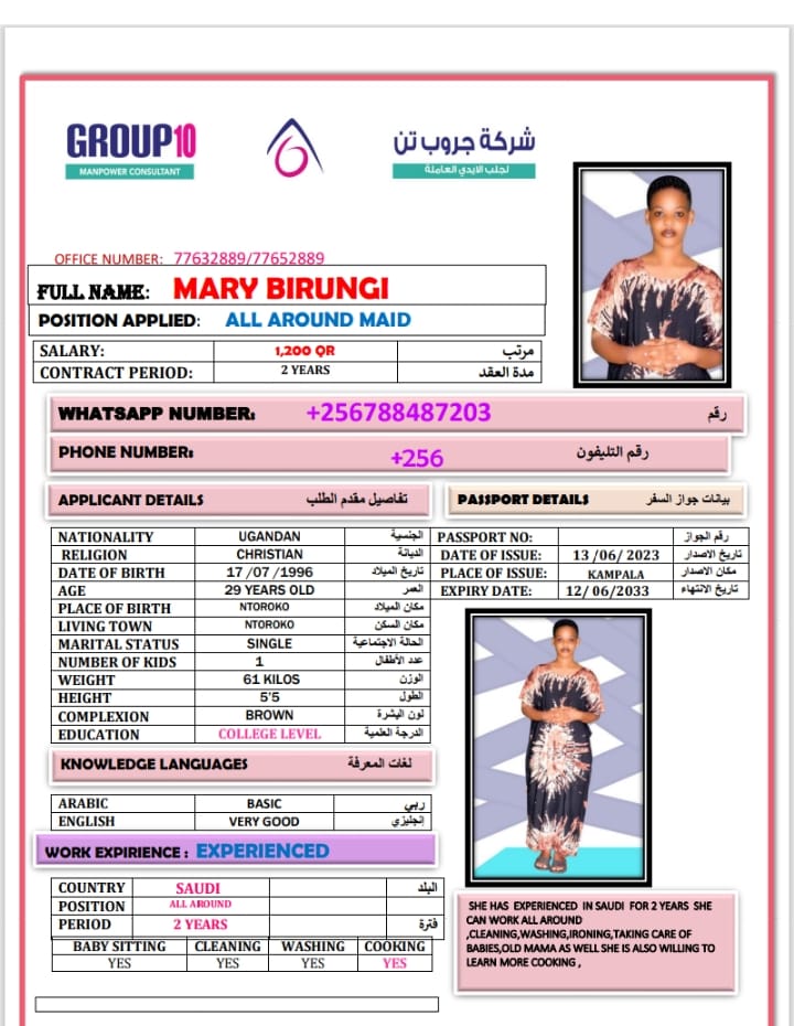 MARY BIRUNGI/ALL AROUND MAID AND COOK