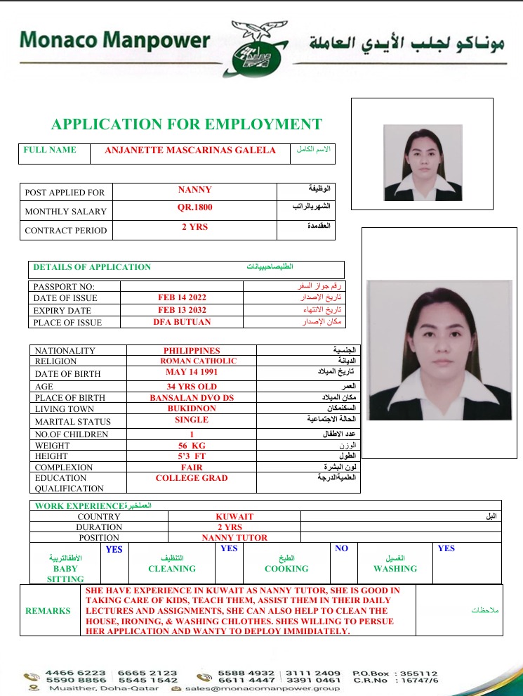 SHE HAVE EXPERIENCE IN KUWAIT AS NANNY TUTOR, SHE IS GOOD IN TAKING CARE OF KIDS, TEACH THEM, ASSIST THEM IN THEIR DAILY LECTURES AND ASSIGNMENTS, SHE CAN ALSO HELP TO CLEAN THE HOUSE, IRONING, & WASHING CHLOTHES. SHES WILLING TO PERSUE HER APPLICATION AND WANTY TO DEPLOY IMMIDIATELY.