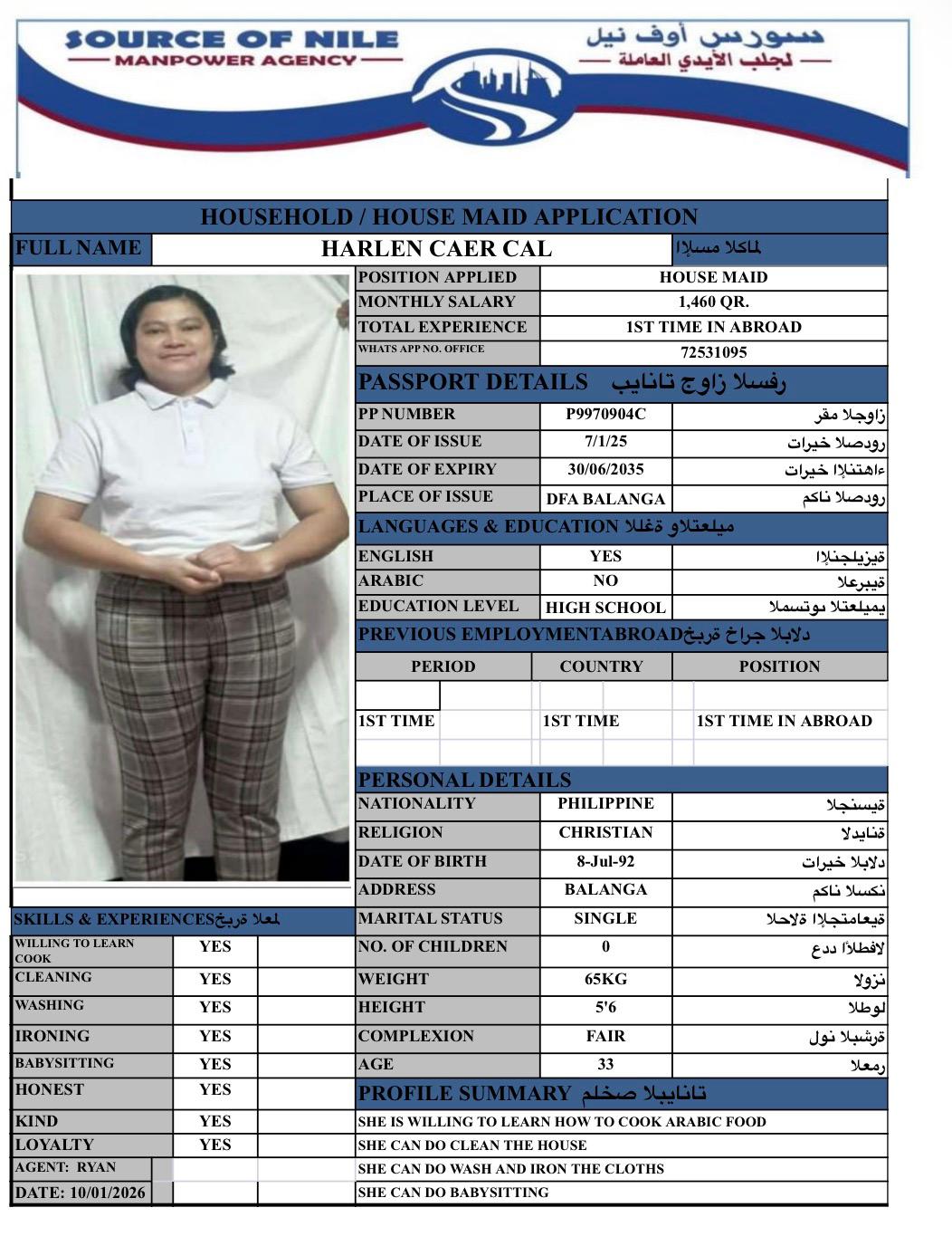 | SHE CAN DO CLEANING THE HOUSE SHE CAN DO WASHING AND IRONING CLOTHES SHE CANOT WILLING TO LEARN HOW TO COOK ARABIC FOOD SHE CAN TAKE GOOD CARE OF CHILDREN | |