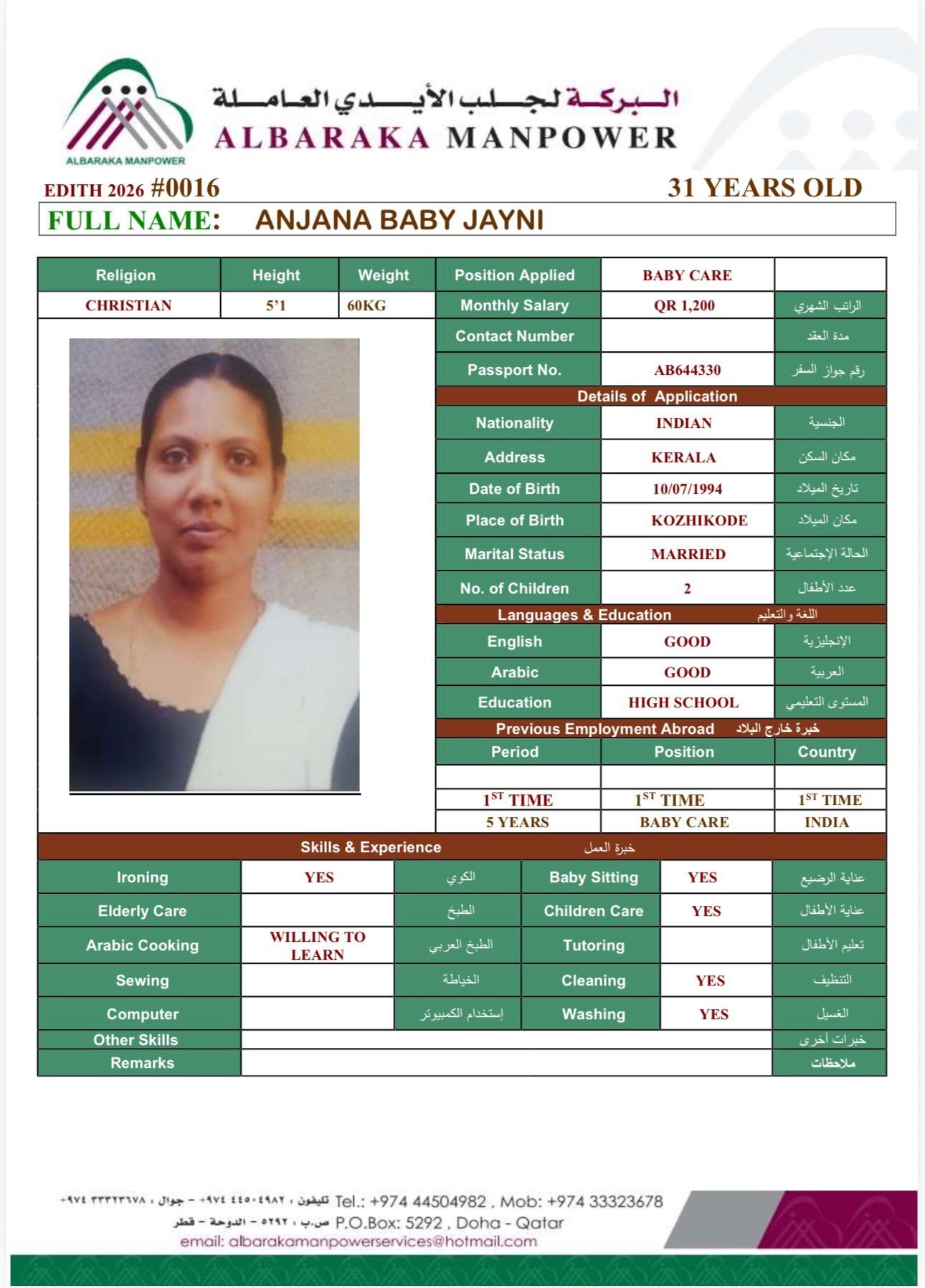 Address Building 53 Ground Floor Room 13, Door 02, Aziziya Doha Qatar