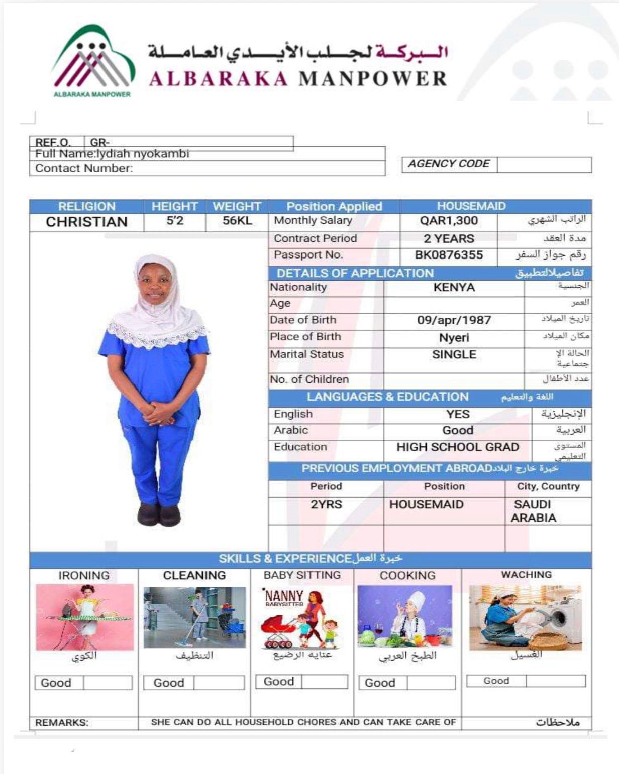 SHE KNOW TO COOK ARABIC FOOD AND DO ALL HOUSE WORKS.