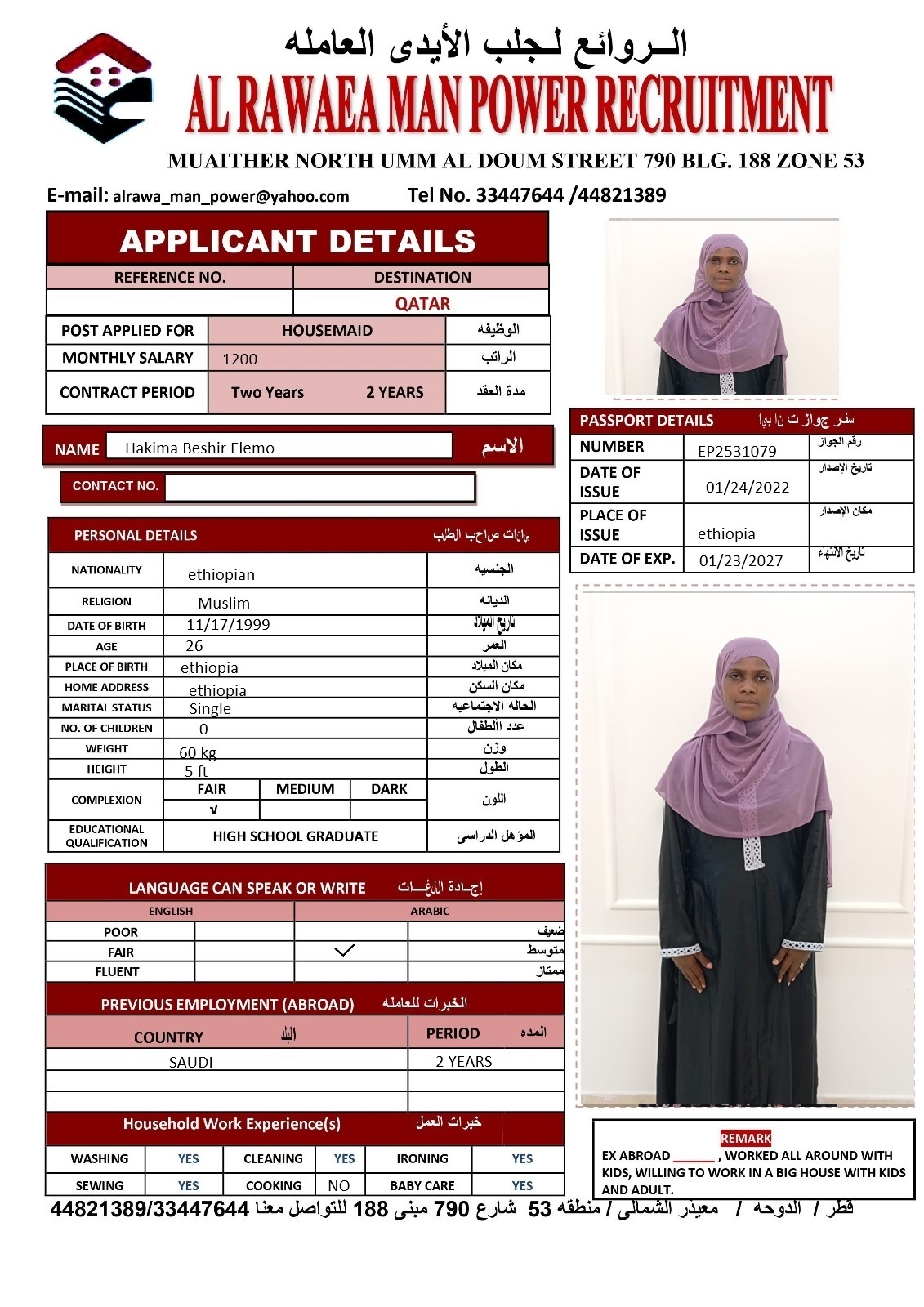 she have 2 years Experians in Saudi she can babysitting, clinging and tacker of old mother cringe and she need leering cooking food