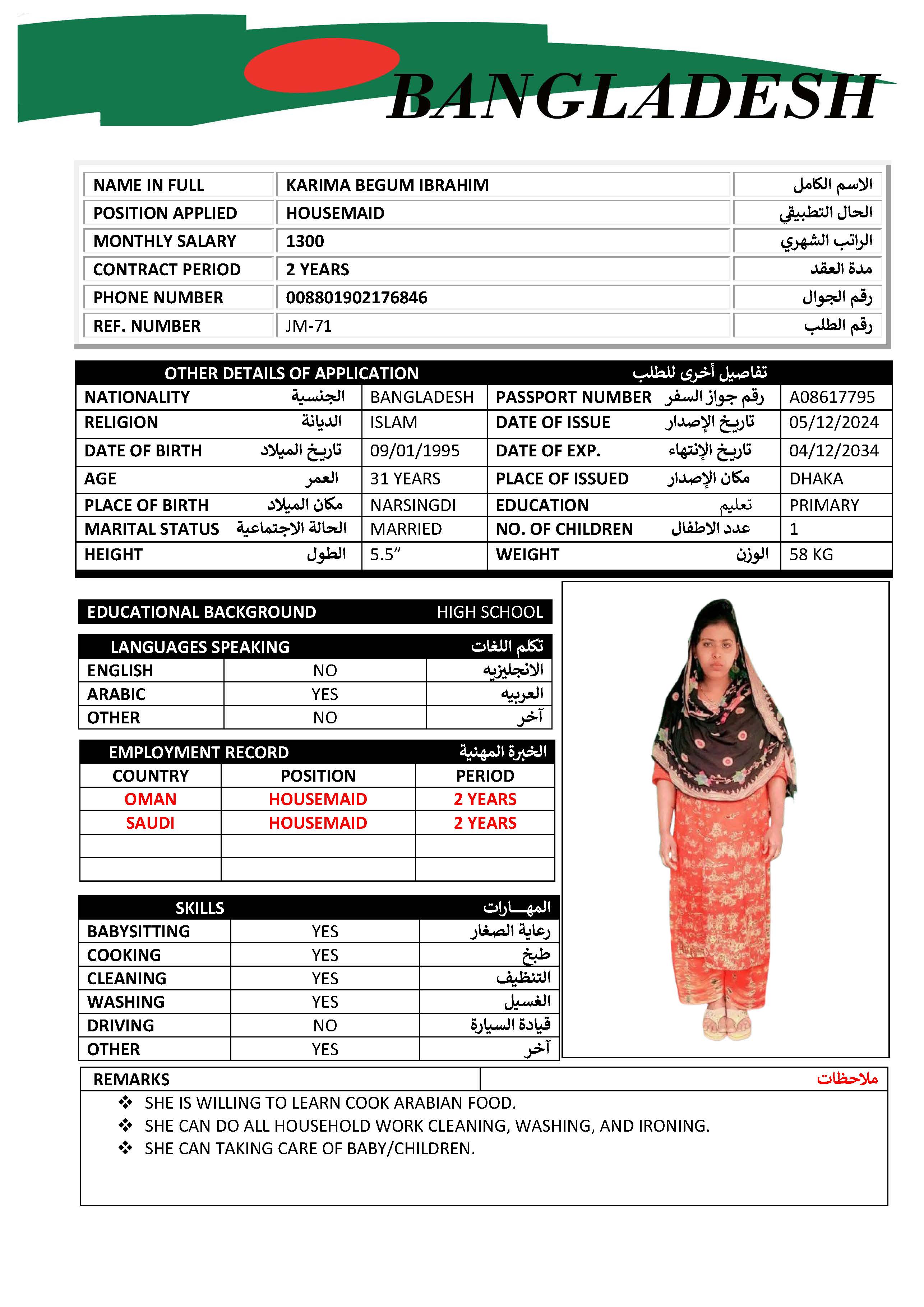 SHE CAN DO ALL HOUSEHOLD WORK CLEANING, WASHING, AND IRONING.