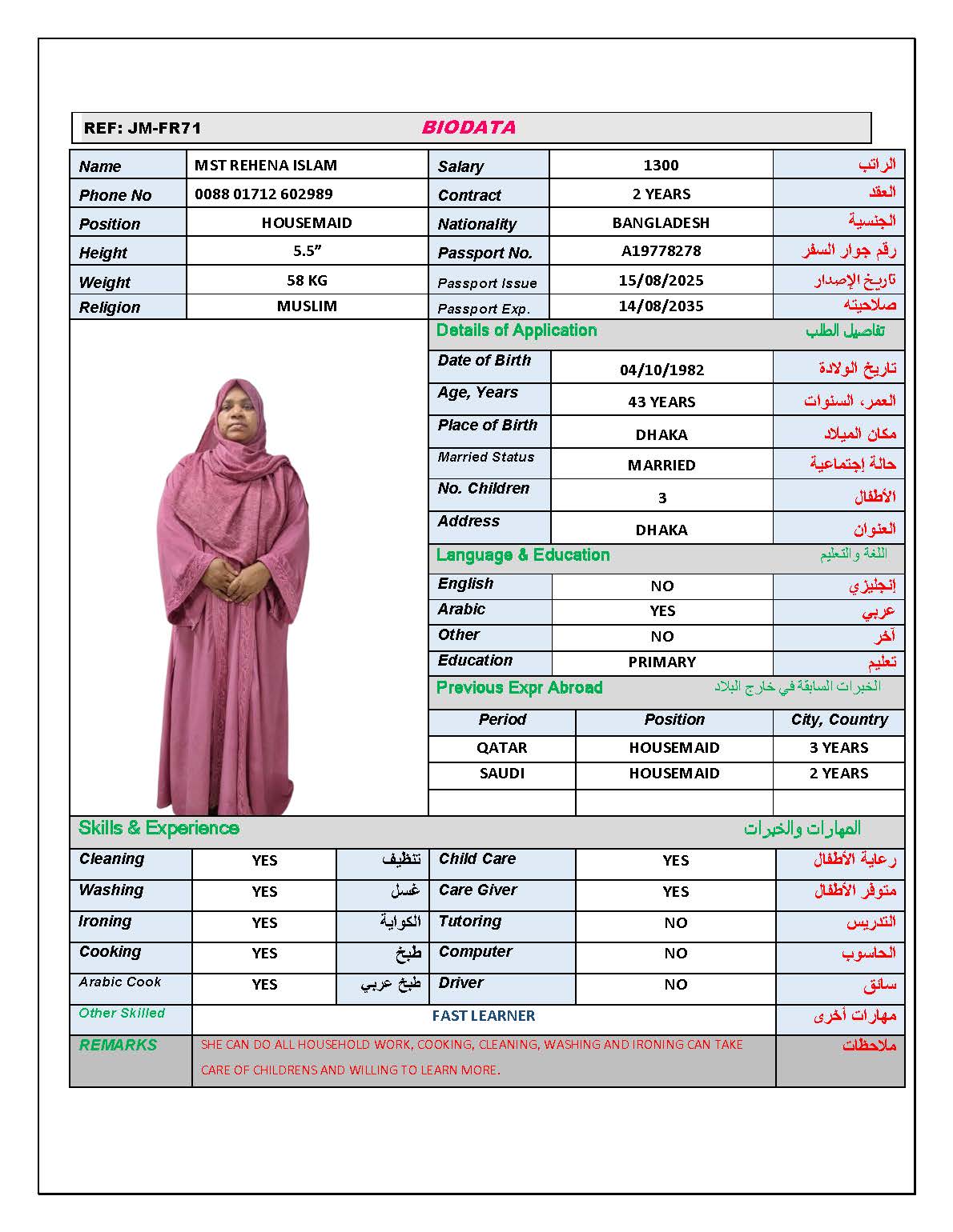 | SHE CAN COOK ARABIAN FOOD SHE CAN DO ALL HOUSEHOLD WORK CLEANING, WASHING, AND IRONING. SHE CAN TAKING CARE OF BABY/CHILDREN. | |