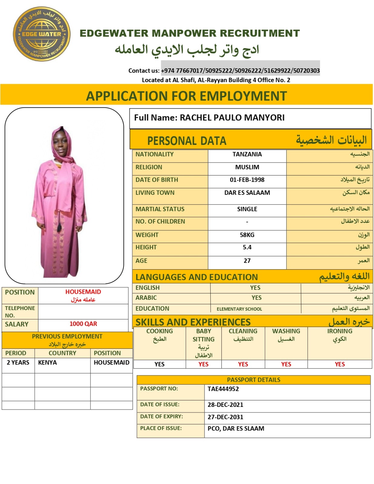 Name - English RACHEL PAULO MANYORI