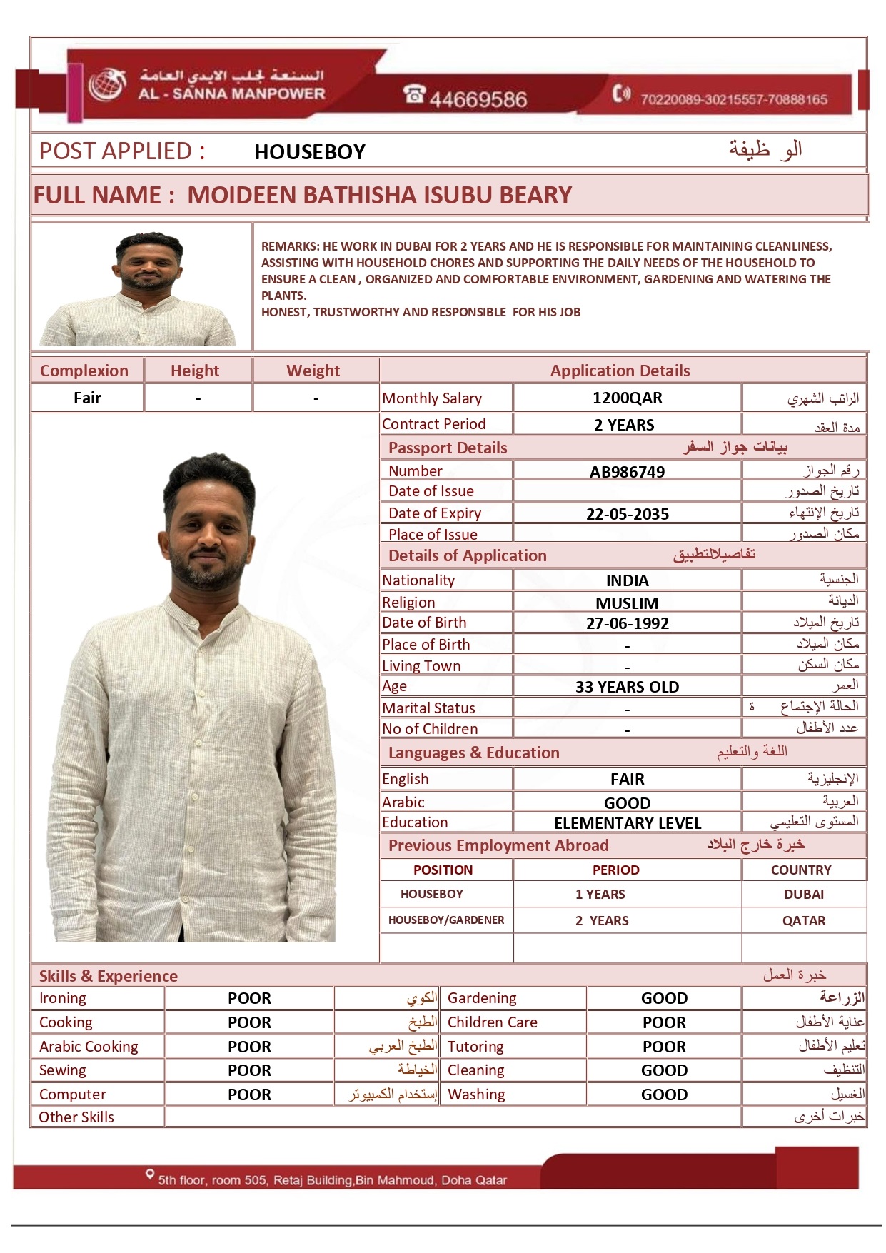 Name - English MOIDEEN BATHISHA ISUBU BEARY