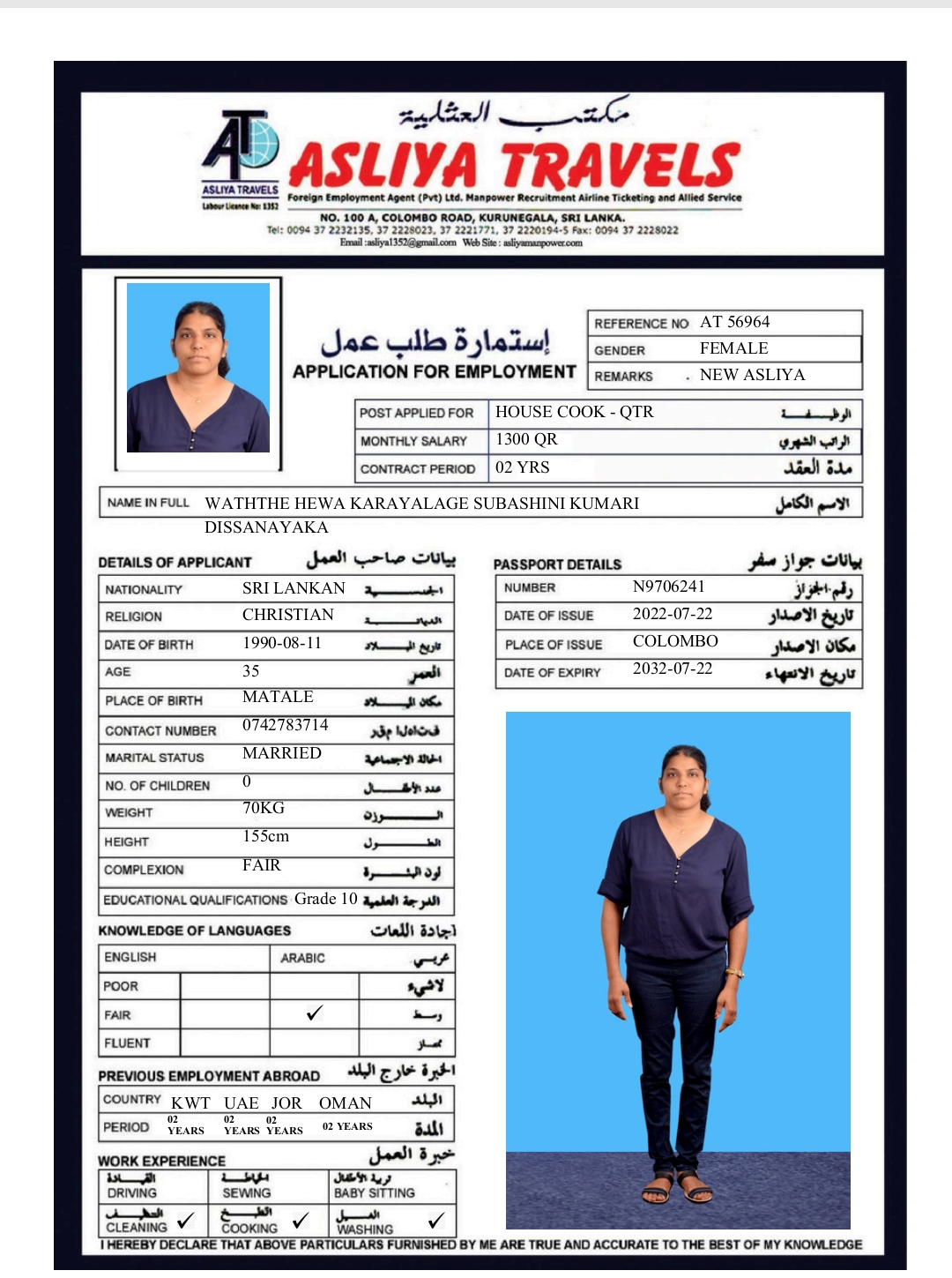 Name - English SUBASHINI KUMARI DISSANAYAKA WATHTHE HEWA KARAYALAGE