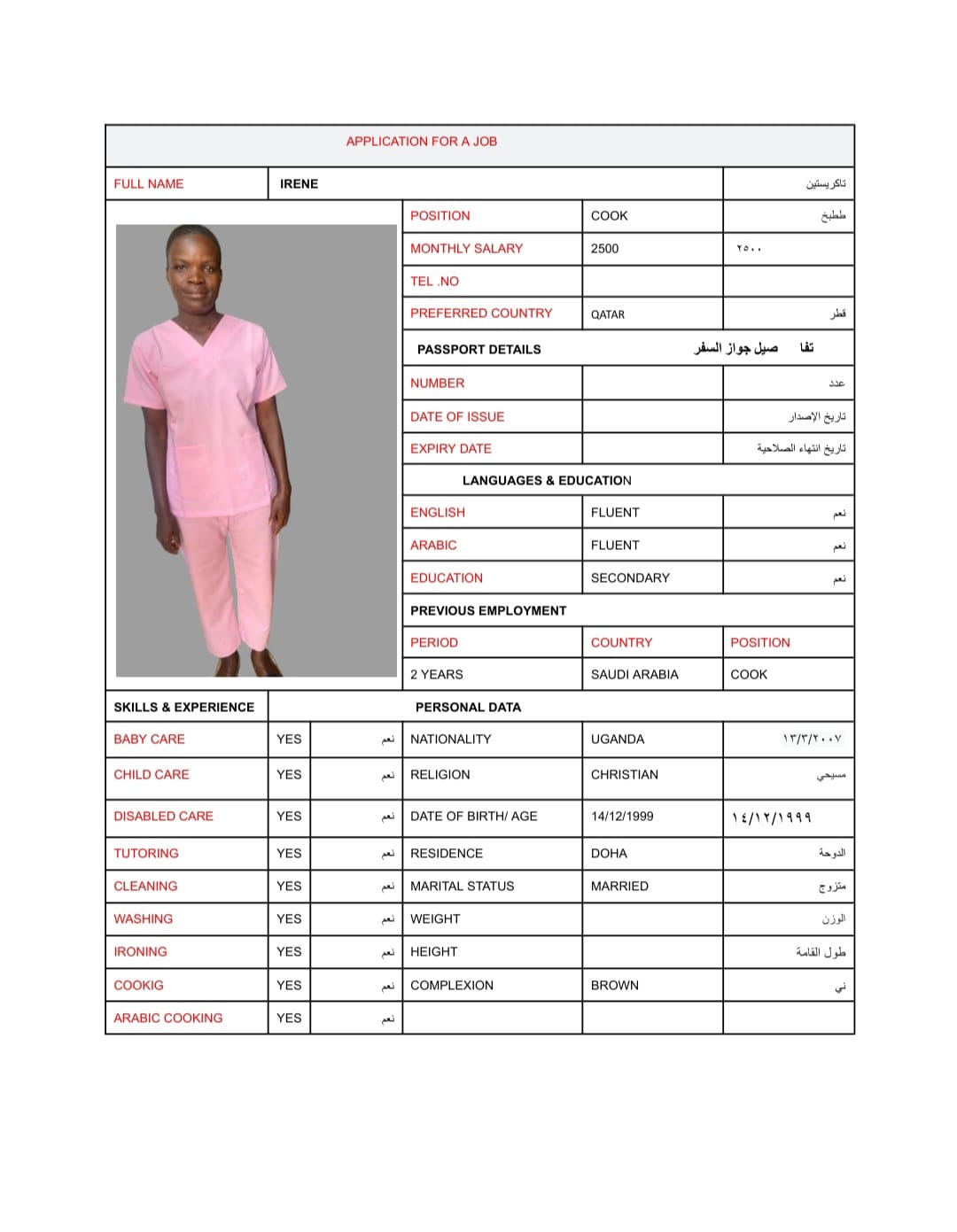 وقالت انها من ذوي الخبرة وجيدة في الطبخ تنظيف الكي الغسيل وجلوس الطفل لديها خبرة في دول الخليج.