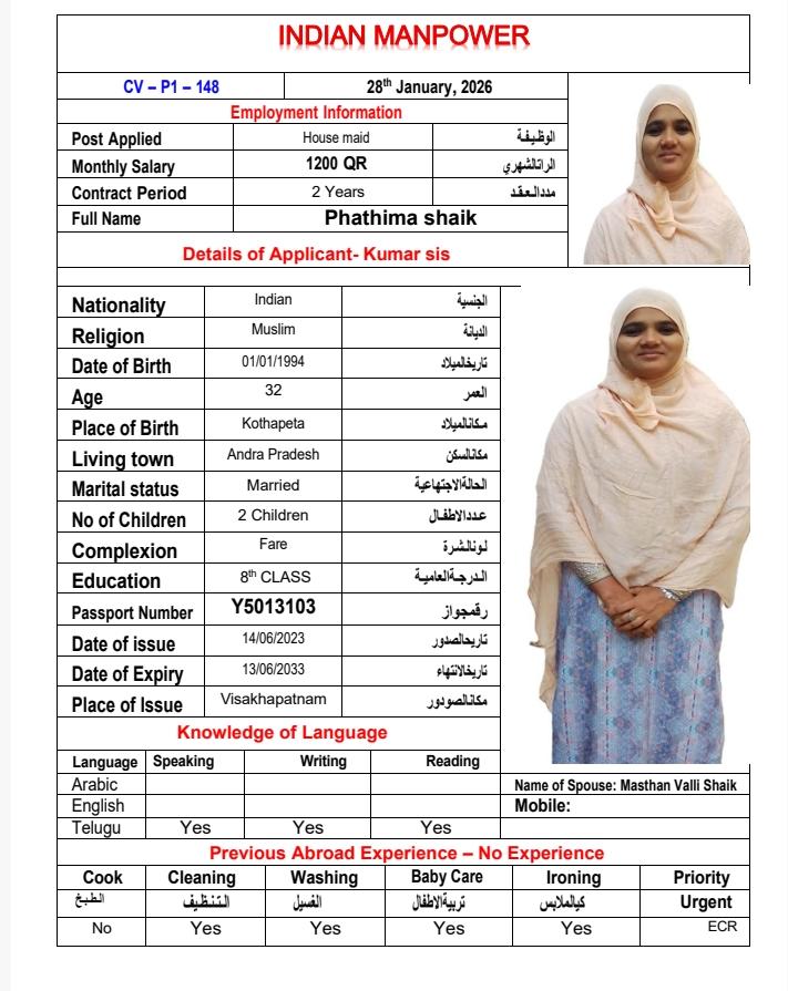 SHE CAN CLEAN WASH, IRON AND BABYSITTER. SHE KNOW COOKING INDIAN FFOD AND WILLING TO LEARN MORE COOKING. SHE CAN UNDERSTAND ENGLISH