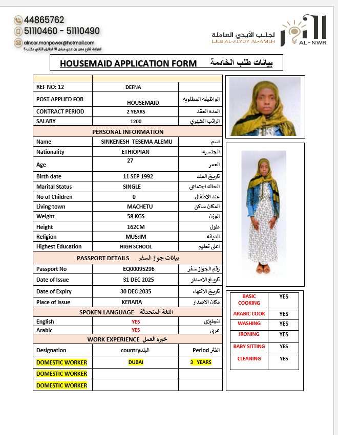 SHE HAVE EXPERIENCE IN DUBAI 3 YEARS SHE KNO0W HOW TO DO ALL CHORCES OF THE HOUSE SHE KNOW HOW TO COOK ARABIC FOOD