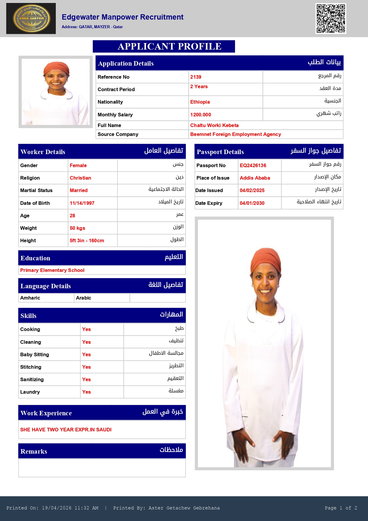 Name - English CHALTU WORKI KEBETA