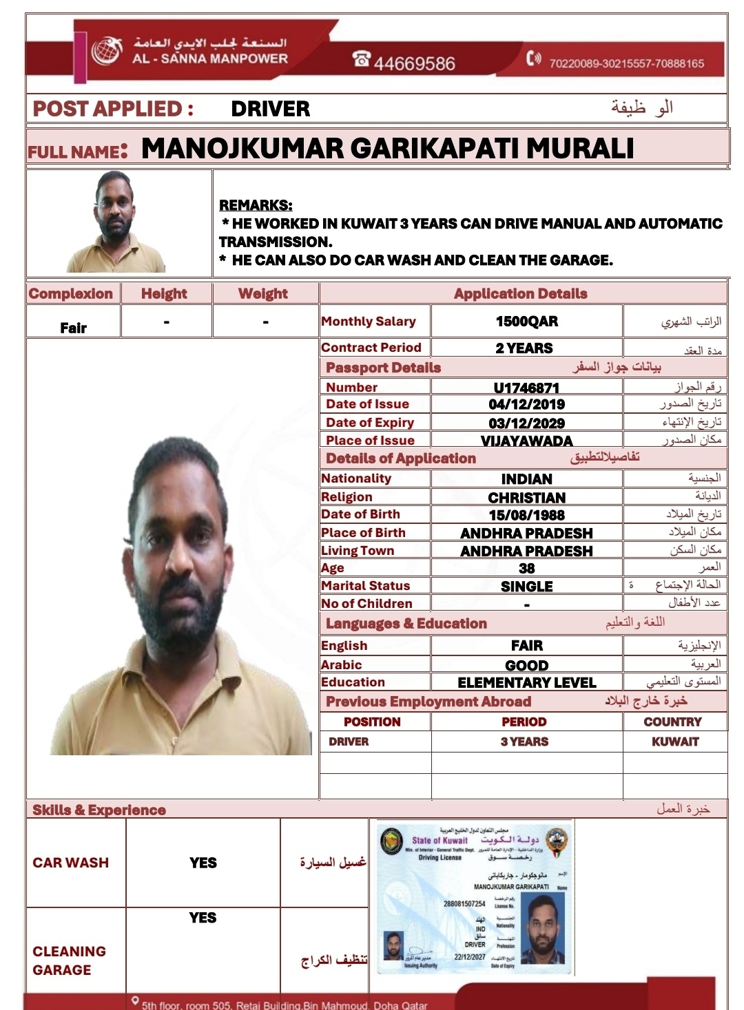 Name - English MANOJKUMAR GARIKAPATI MURALI