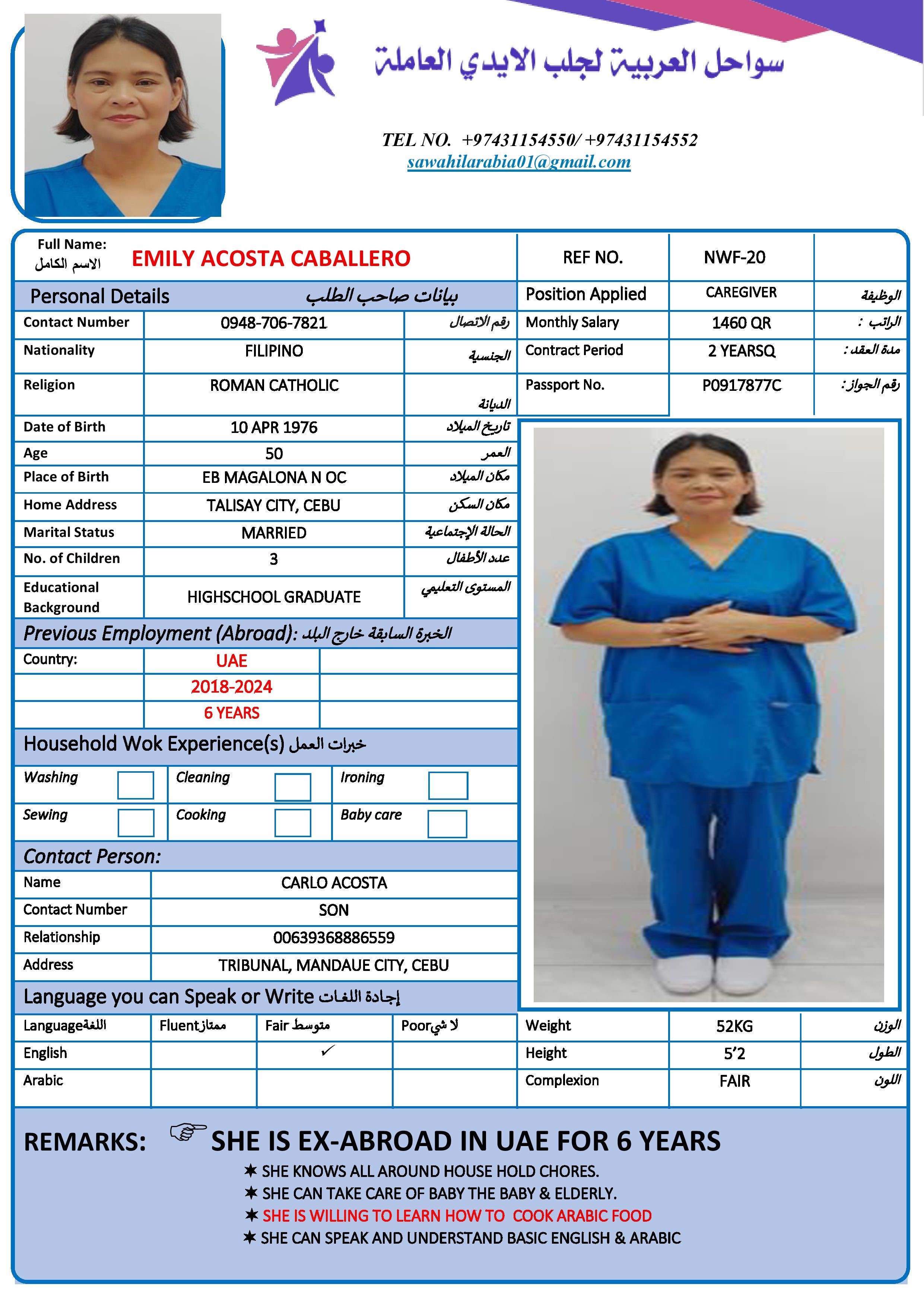 SHE KNOWS ALL AROUND HOUSEHOLA CHORES SHE CAN TAKE CARE OF BABY AND ELDERLY SHE IS WILLING TO LEARN HOW TO COOK ARABIC FOOD SHE CAN SPEAK AND UNDERSTAND BASIC ENGLISH AND ARABIC