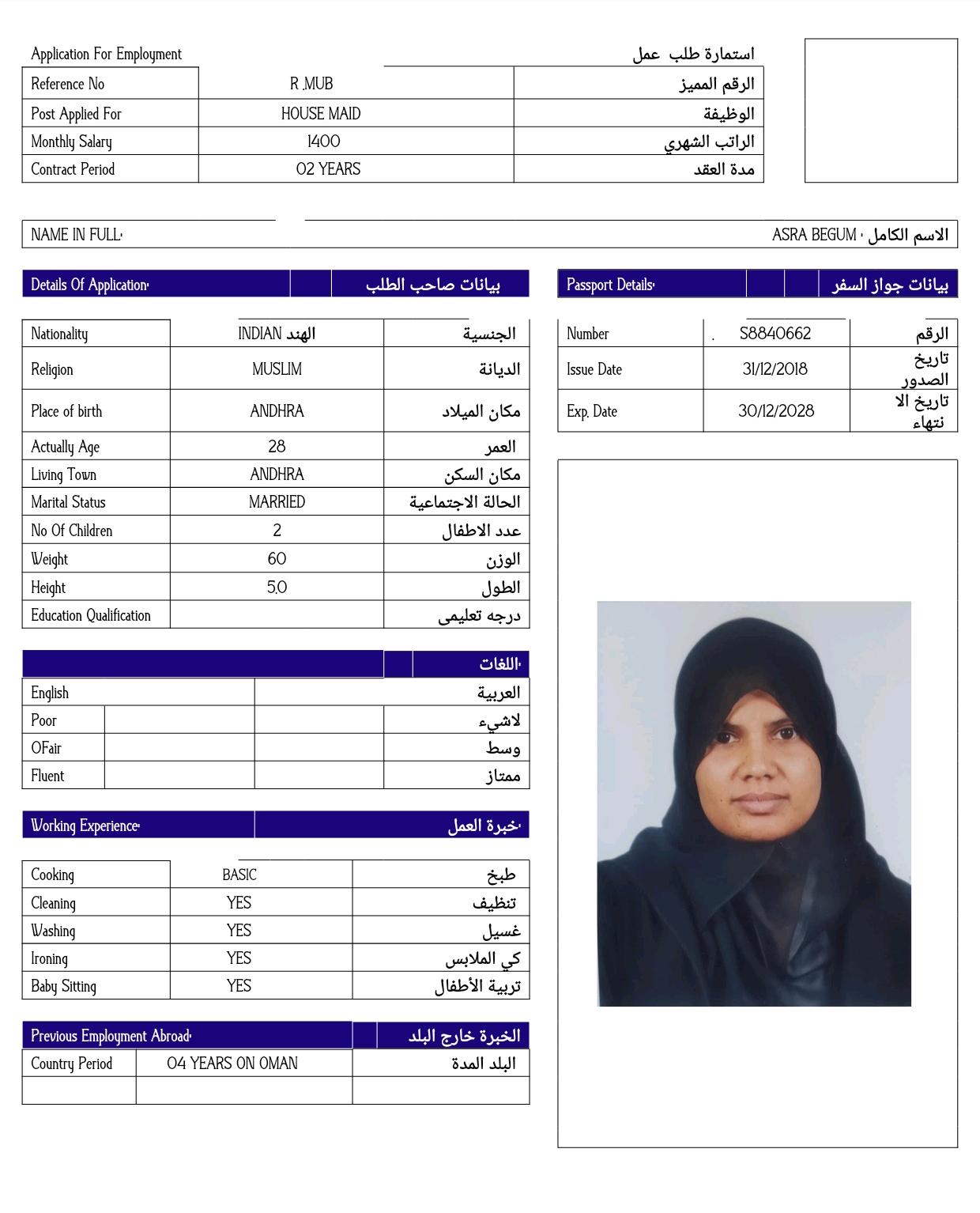 Name - English ASRA BEGUM / BASIC COOK